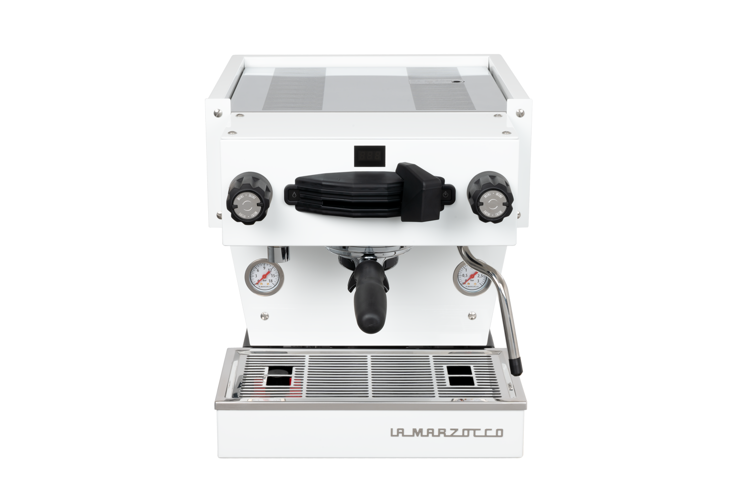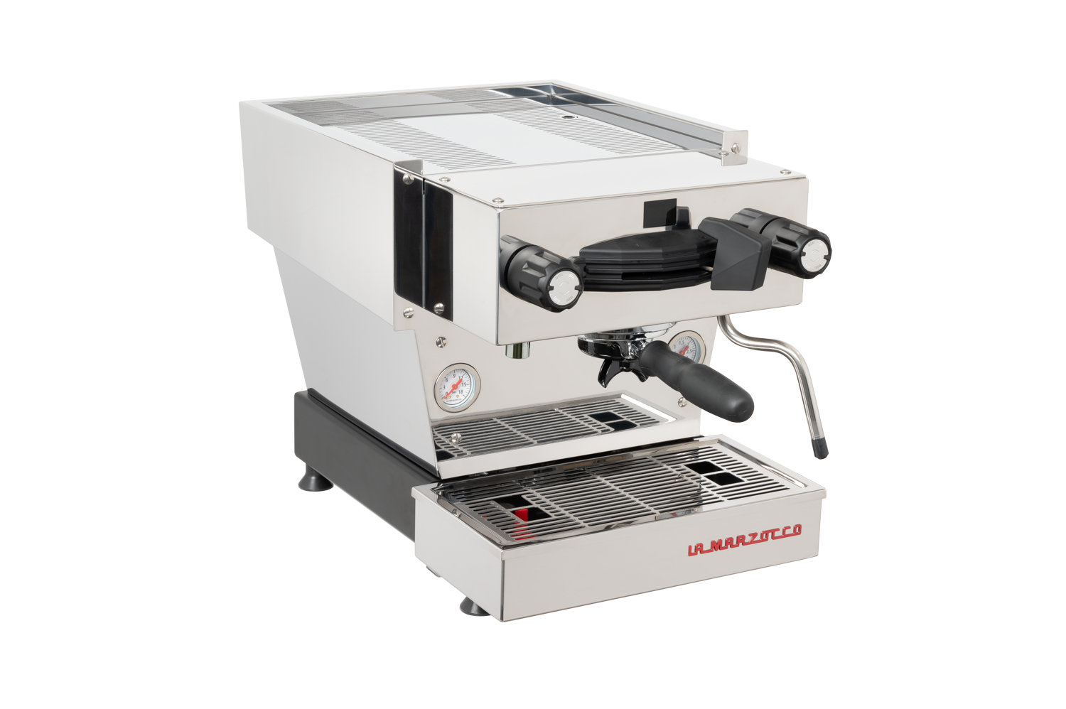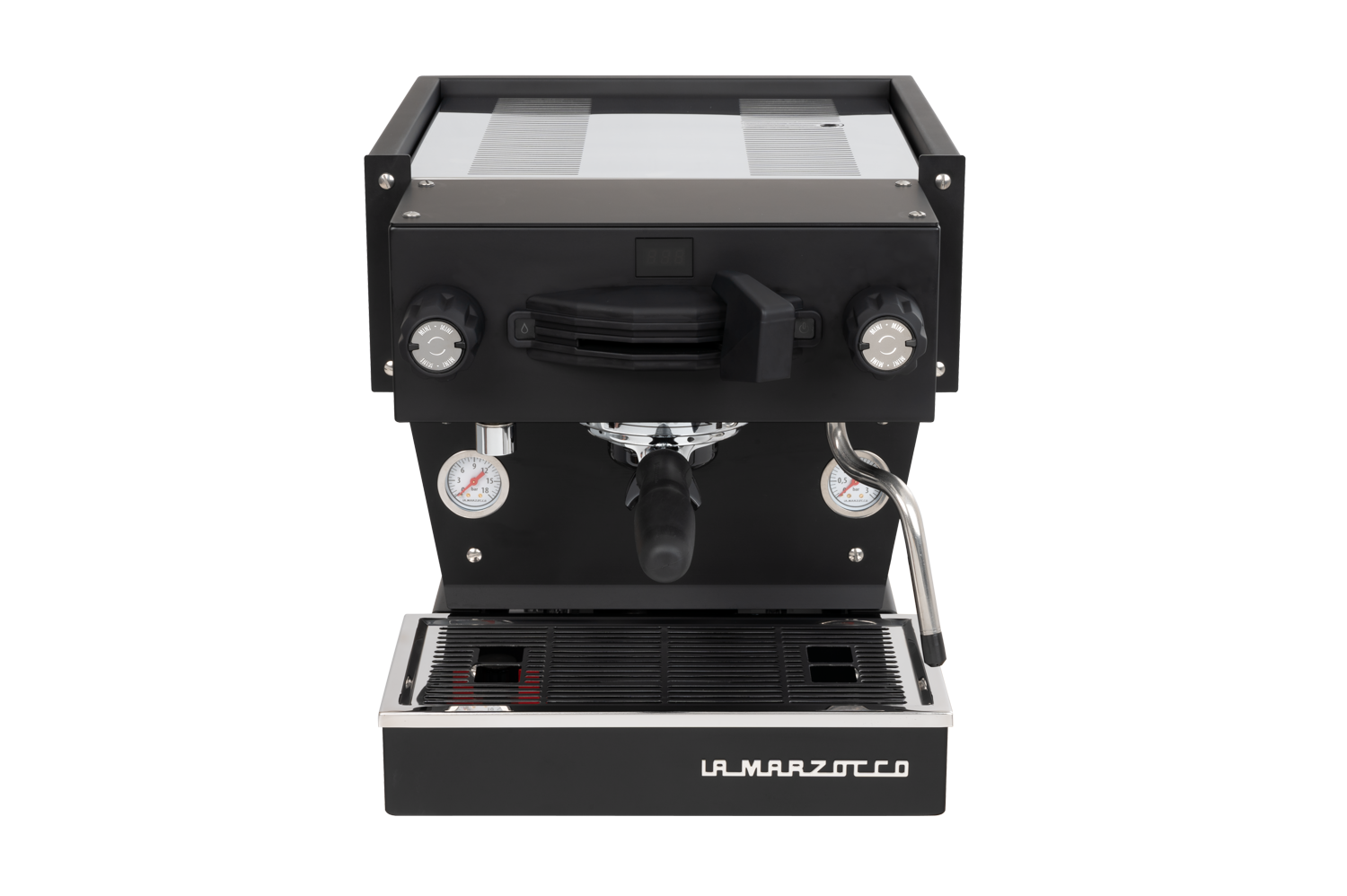 Linea Mini in Black. The Linea Mini is La Marzocco's reimagined espresso icon for the home — turning every espresso moment into an experience. Dual boilers with PID temperature control, a new pre-infusion system with soft saturation and self-cleaning, built-in shot timer, and Brew-by-Weight compatibility with La Marzocco connected scales. Features a commercial-grade group cap, Pro Touch steam wand, and La Marzocco Home App integration.